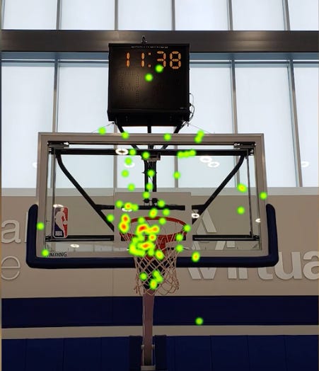 There are many other examples like this. One of the most convincing recently was work by Daniel Laby, a sports vision researcher in New York, who used eye-tracking goggles with NBA players for free-throw shooting. The heat maps below show where their gaze was focused, and you can see the differences for yourself: